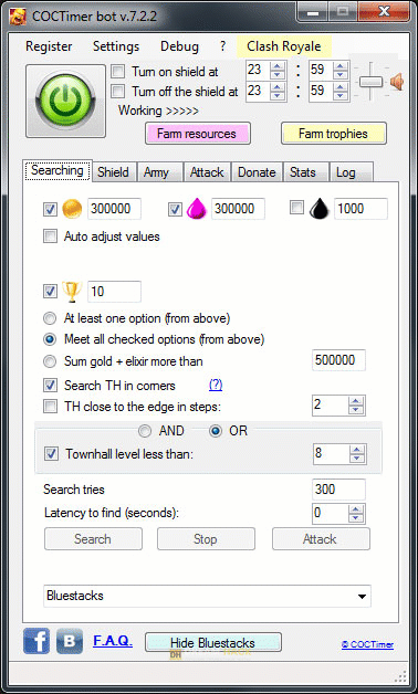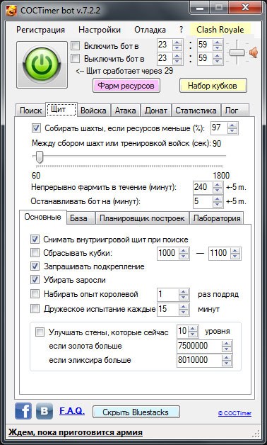 Нажмите одну из кнопок "Фарм ресурсов" или "Набор кубков" - и бот сам сам себя настроит, учитывая ваш уровень ратуши и текущие кубки. Он натренирует войско, подождет, пока оно приготовится, продонатит соклановцам подкрепление, а когда войско будет готово, сам запустит поиск, найдет вкусную жертву и нападет так, чтобы никто не смог понять, что атакует бот!